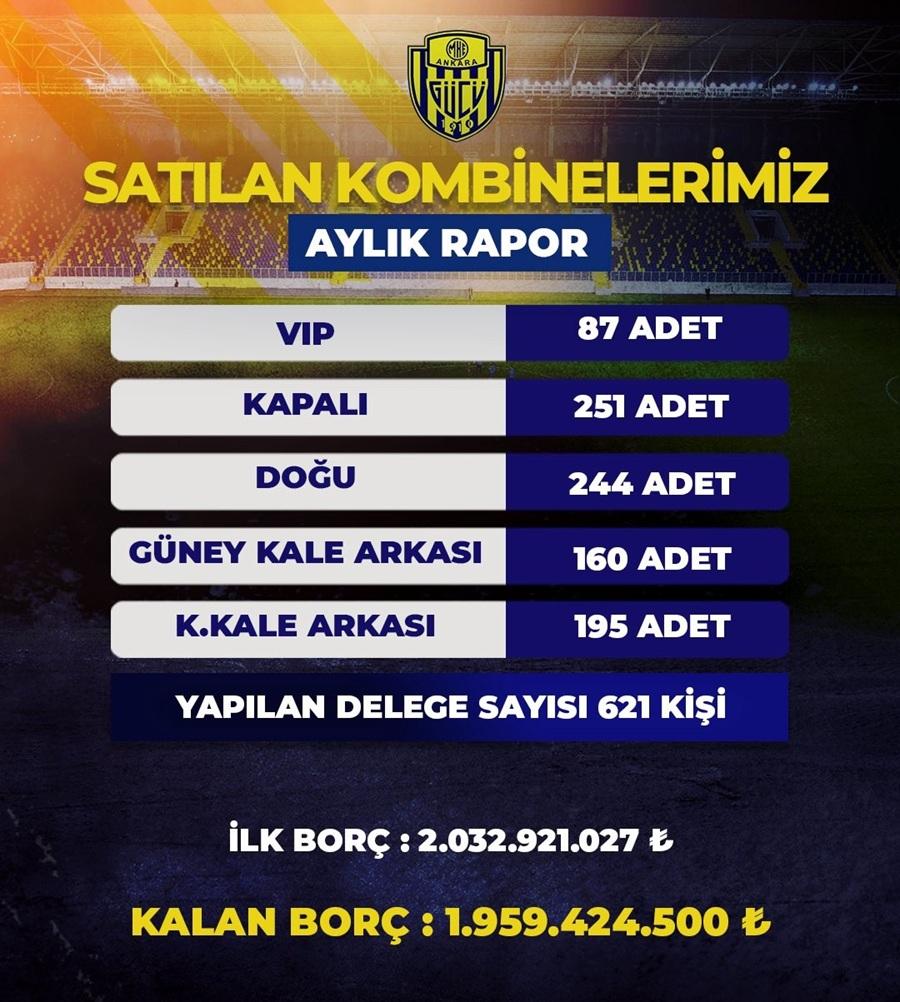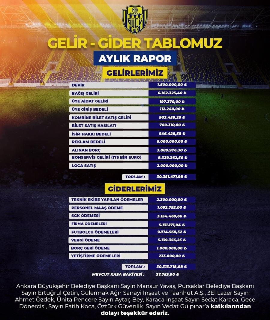 Ankaragücü yönetimi, Ağustos ayı gelir gider tablosunu paylaştı.