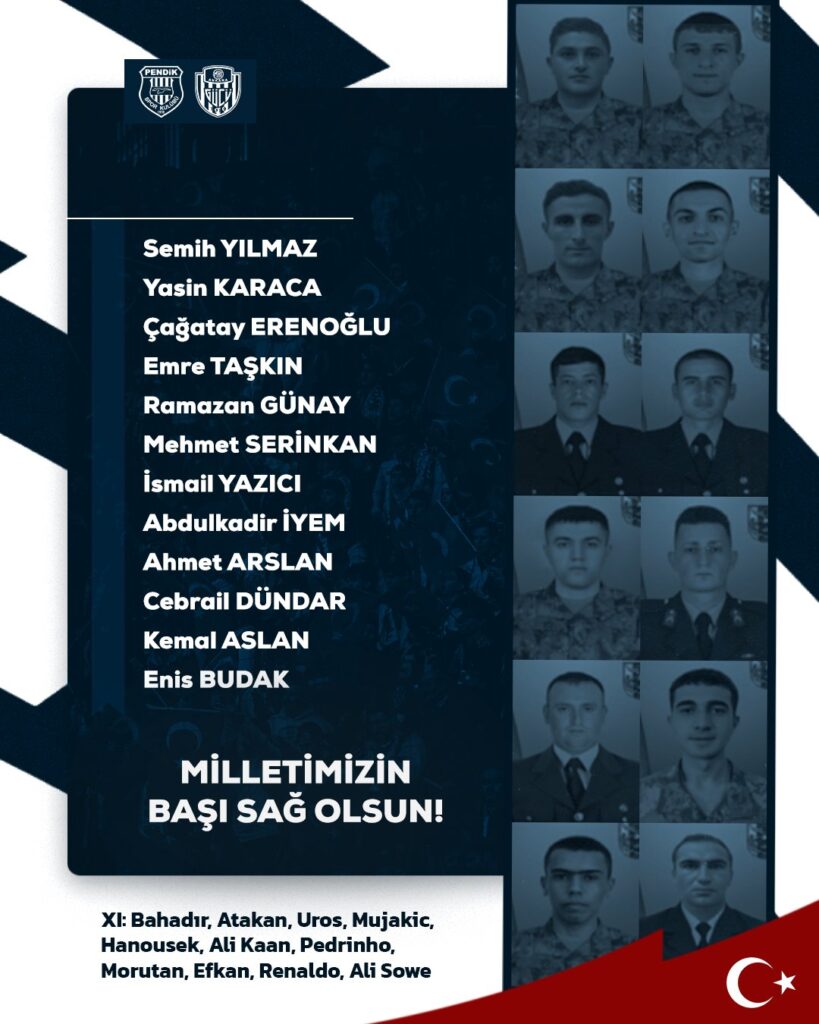 Süper Lig’de Ankaragücü, deplasmanda Pendikspor ile oynayacağı karşılaşmada forma giyecek oyuncuların yerine, geçtiğimiz günlerde Pençe Kilit Harekatı bölgesinde hain terör örgütüyle çıkan çatışmada şehit olan 12 kahramanın adlarının yer aldığı bir görsel paylaştı.