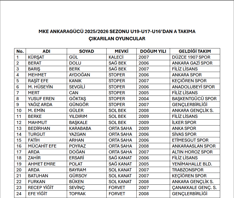 Ankaragücü’nde 2025/2026 Sezonu başında teknik direktör Mustafa Kaplan’ın raporu doğrultusunda A Takım’a çıkarılan oyuncuların filiz lisans aldıkları takımlar şöyle:
